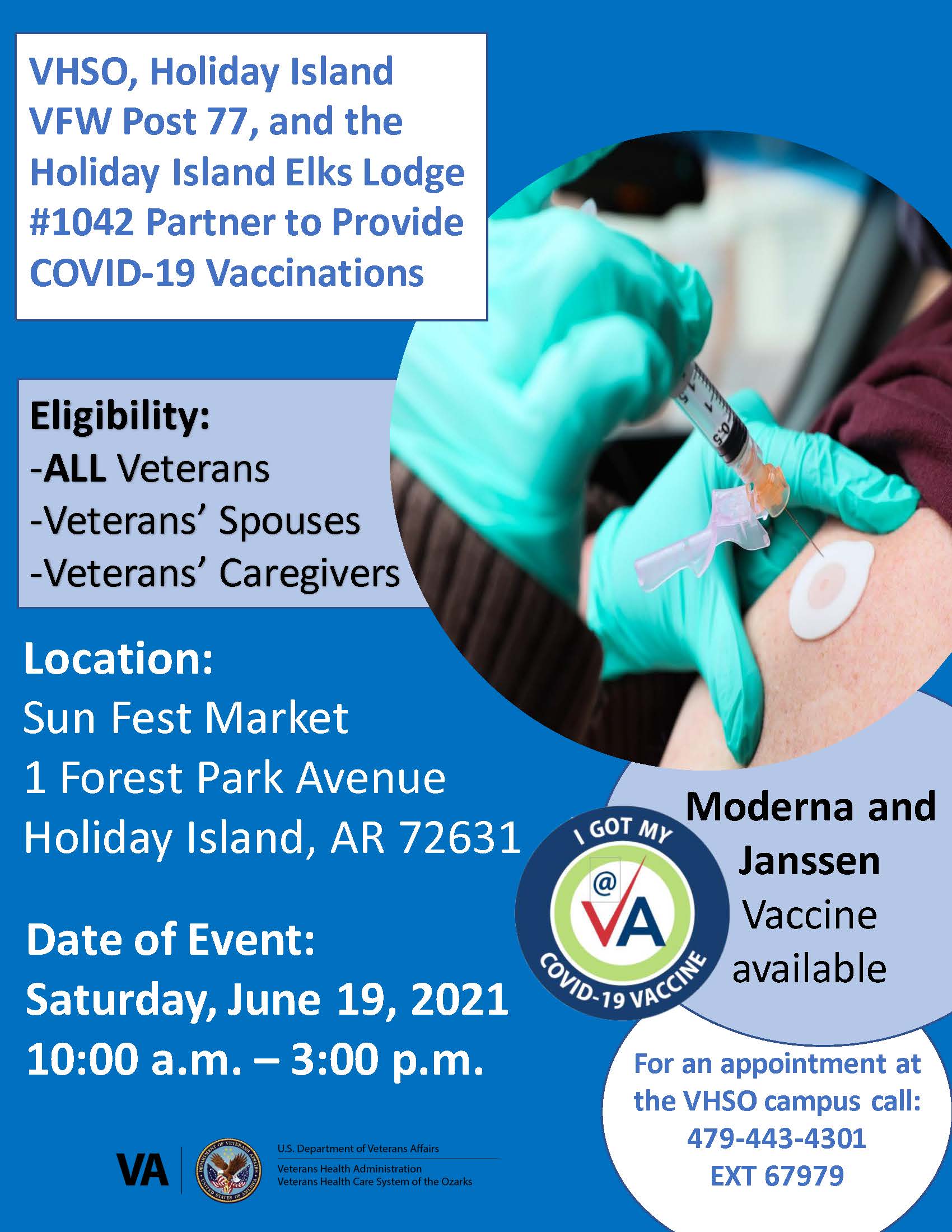 VHSO is proud to partner with the Holiday Island VFW Post 77 and Holiday Island Elks Lodge #1042 to provide COVID-19 vaccines to Veterans, their spouses, and their caregivers. The event will be held Saturday, June 19, 2021 from 10:00 a.m.-3:00 p.m. at Sun Fest Market located at 1 Forest Park Avenue Holiday Island, AR 72631.
