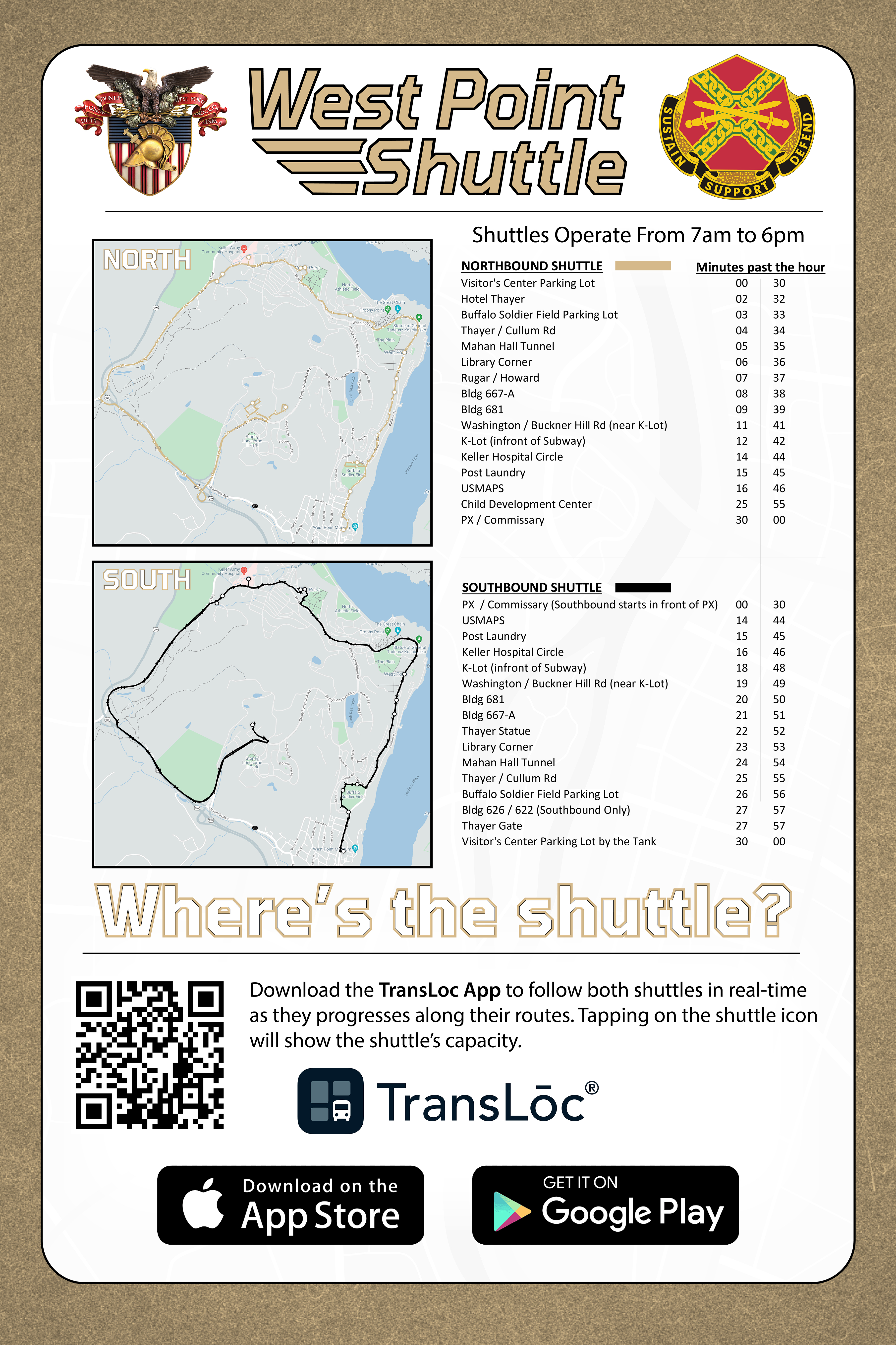 - Blue Route: shuttles from Suptās Box to K-Lot to WPMS, Keller, USMAPS