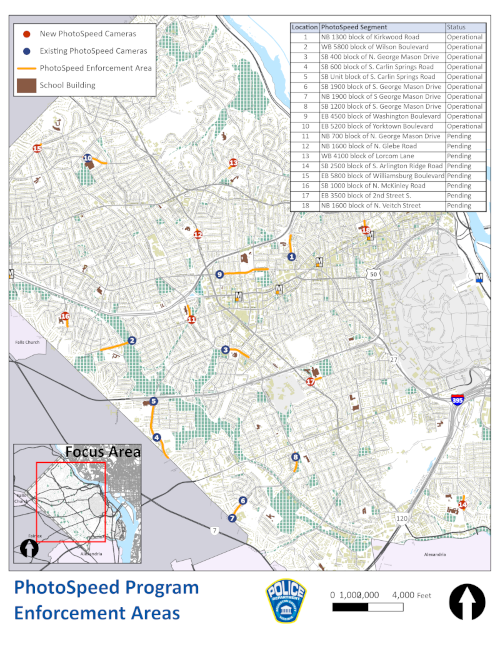 El programa PhotoSPEED se puso en marcha en agosto, al comienzo del año académico 2024-2025, con 10 radares en varias zonas escolares del condado de Arlington. En los dos primeros meses del programa PhotoSPEED tras la conclusión del período de advertencia, se han emitido 10,721 multas por exceso de velocidad por infracciones en los radares de tráfico. Las ubicaciones actuales del programa se encuentran a continuación y las infracciones por exceso de velocidad en estas áreas resultarán en una multa: