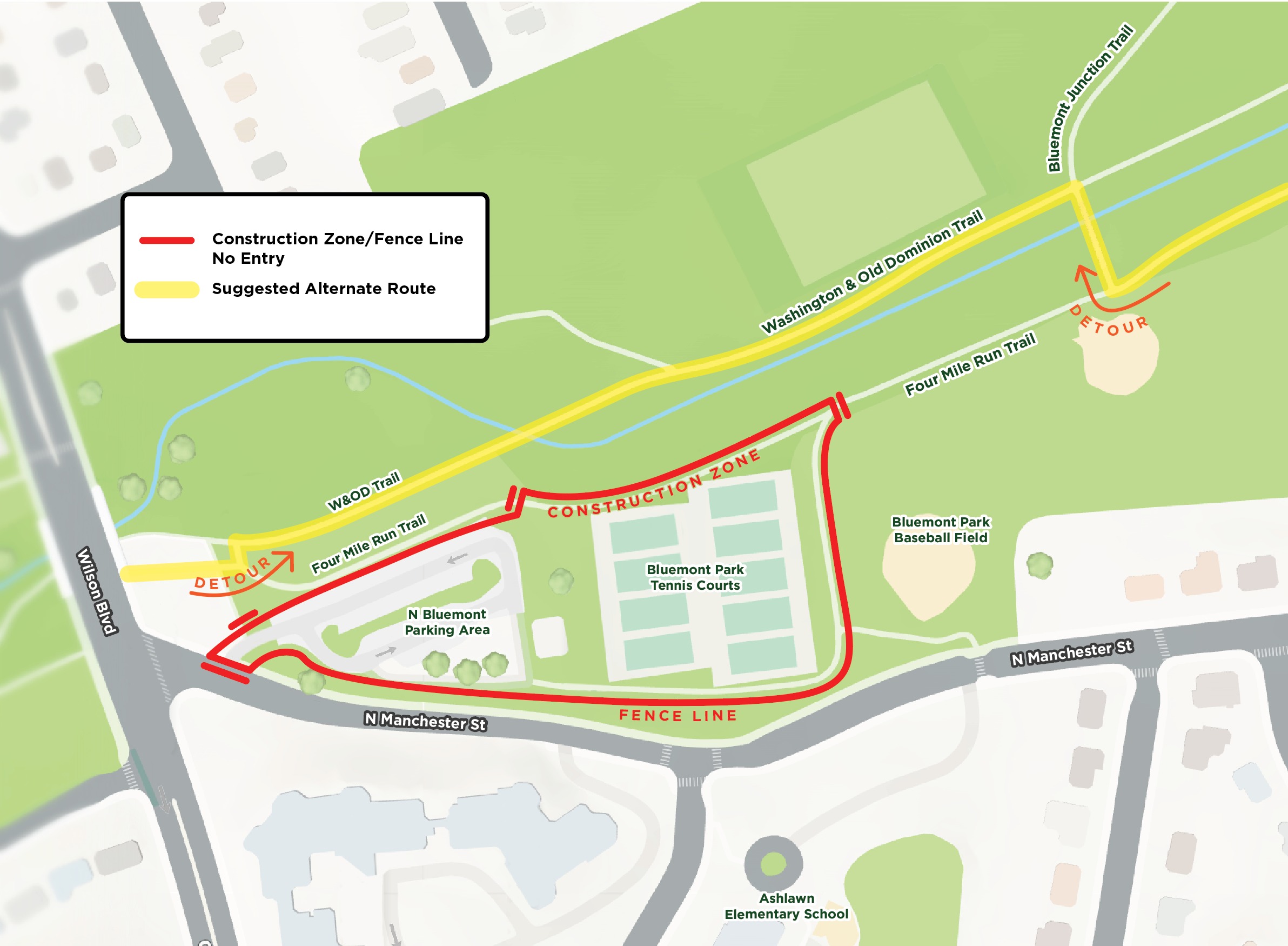 During construction the tennis courts, parking lot, and a small section of the Four Mile Run Trail will be fenced off and closed to the public. Four Mile Run Trail users can use the adjacent W&OD Trail to avoid the small, closed trail segment before returning to Four Mile Run Trail. See the map below for detour information.