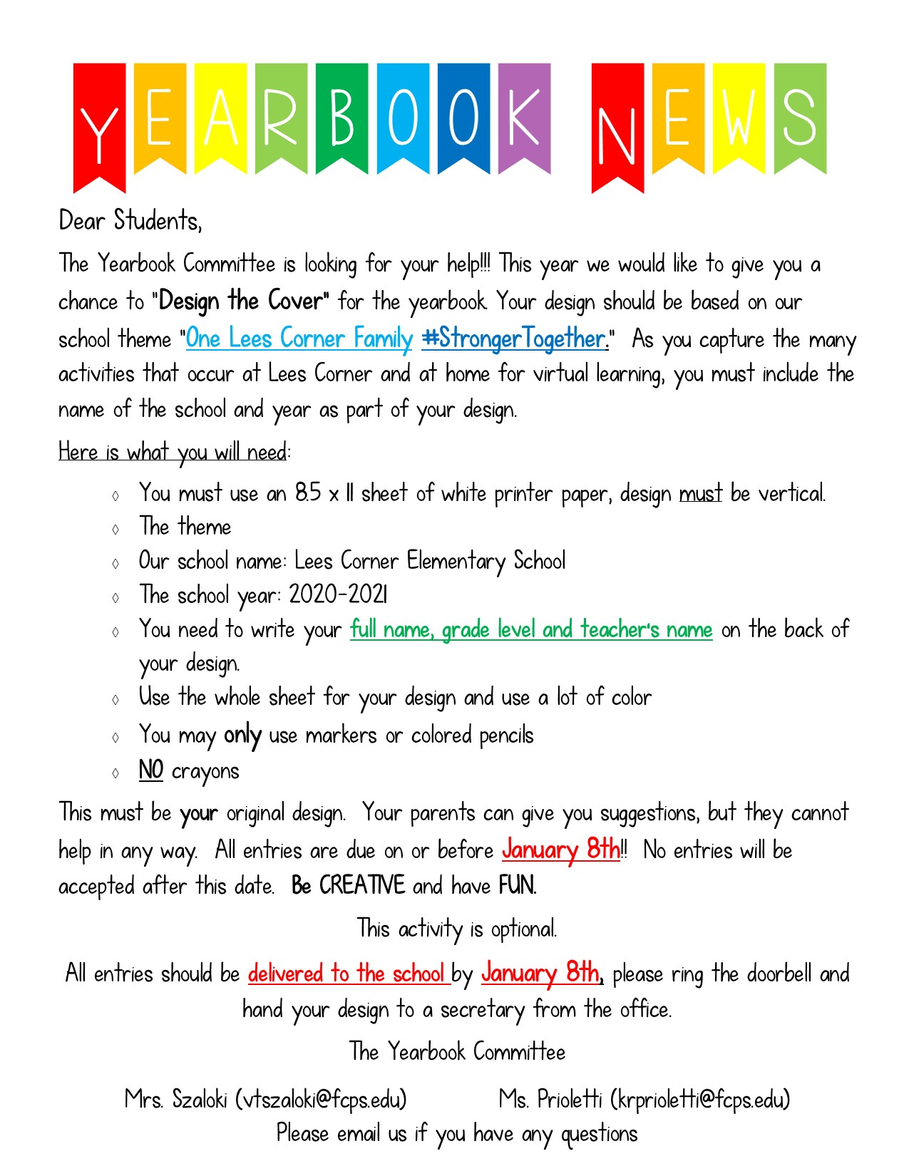 The Yearbook Committee is looking for your help!! This year we would like to give you a chance to “Design the Cover” for the yearbook. Your design should be based on our school theme “One Lees Corner Family #StrongerTogether.” As you capture the many activities that occur at Lees Corner and at home for virtual learning, you must include the name of the school and year as part of your design.