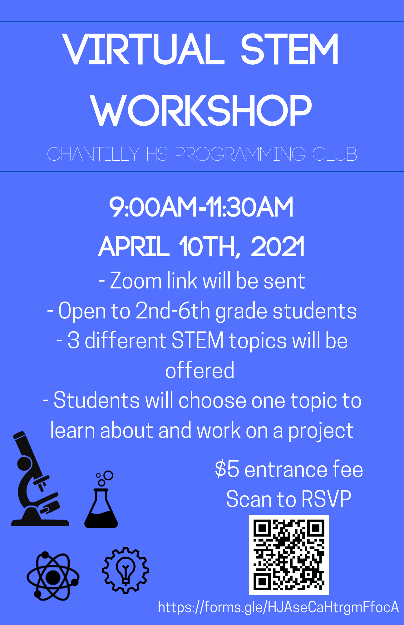 Click here to see information about Chantilly High School's Virtual STEM Workshop this Saturday, April 10, from 9:00 - 11:30 a.m.