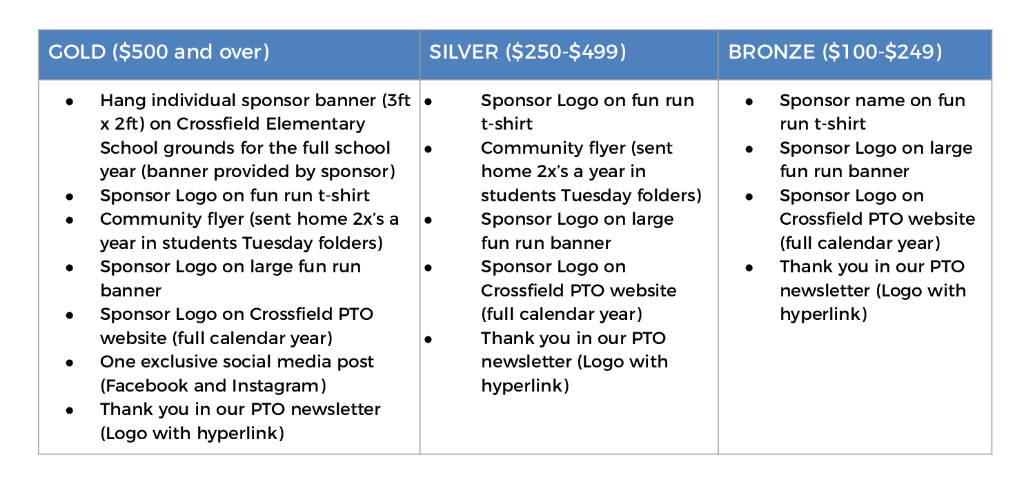 It's that time of year to start getting pumped for the Fun Run!!Do you own a local business, or work for a fantastic company that likes to support the community? If so, please consider partnering with our school by being a Fun Run sponsor! Now is your chance to be a crucial part of our school’s main fundraiser. Your sponsorships help cover costs so that all dollars raised go directly to support our students, teachers, and school. If you are interested or would like to know more, please contact Emily Christenson (emilychristenson@gmail.com) or Heather Scott (chezlewy@hotmail.com). The sponsorship deadline is Sept. 9. Please click here for details on how your sponsorship can also help your business.