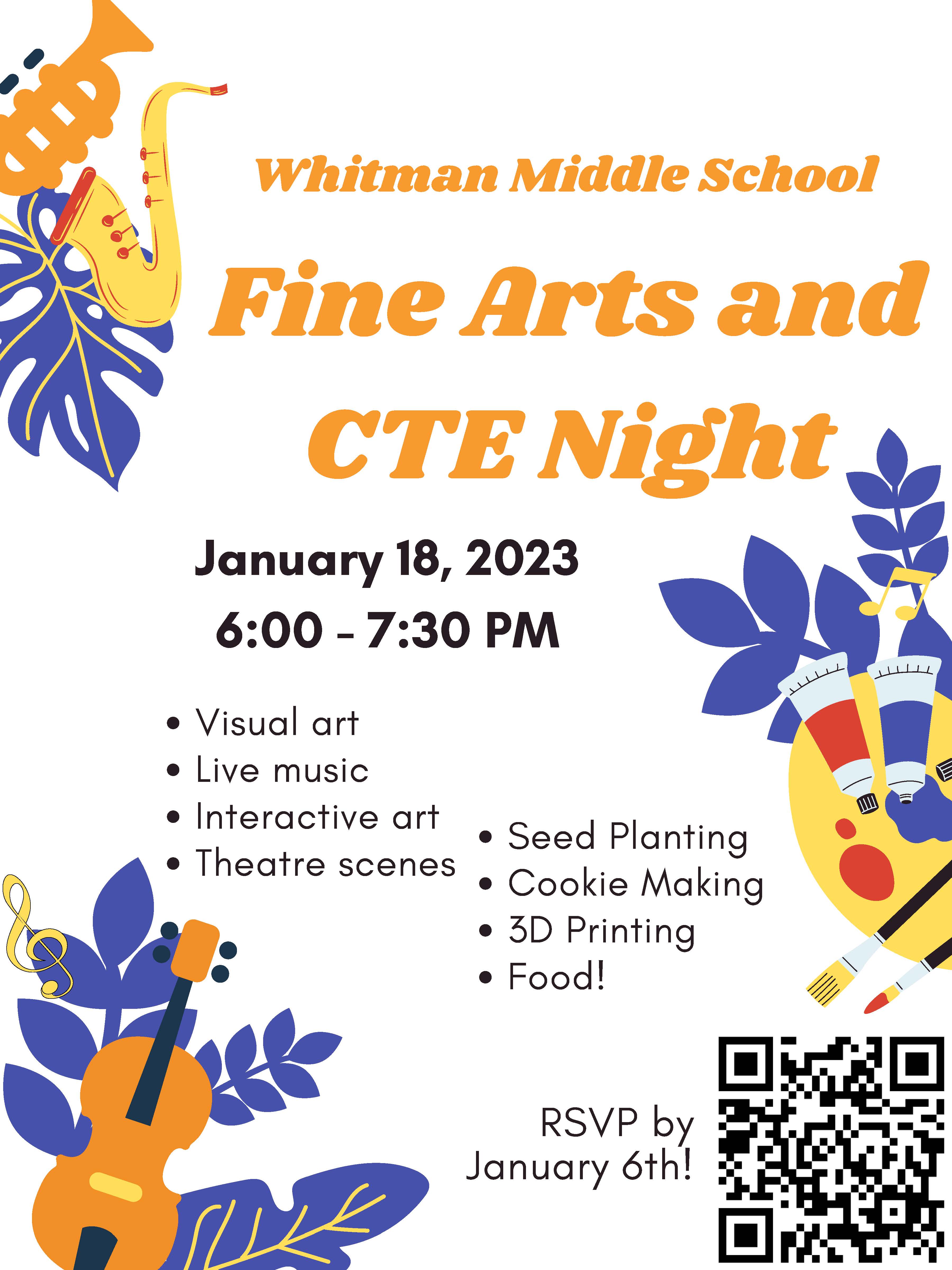The Whitman Middle School Fine Arts Department is excited to present their Fine Arts Community Night! We welcome you to join us for a hands-on evening exploring visual art, music, theatre, and CTE! This event is free and open to all ages on Wednesday, January 18th, 2023 from 6:00-7:30 pm at Whitman Middle School.