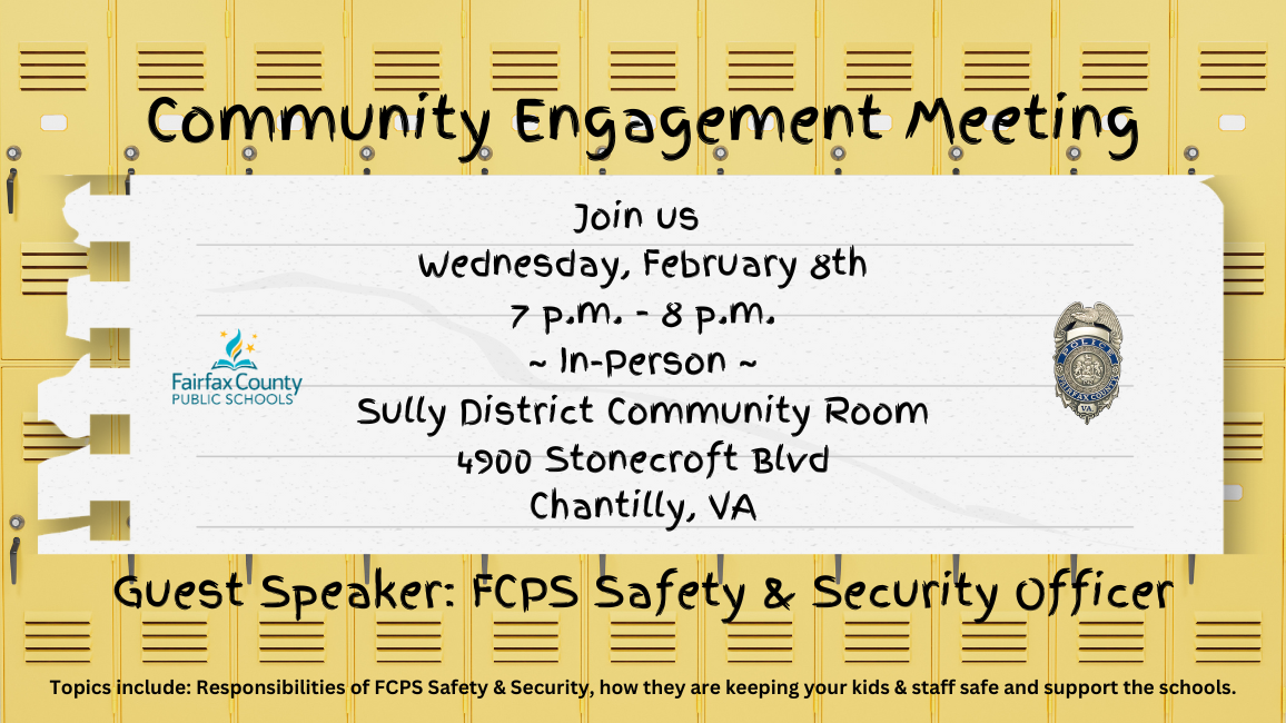 This meeting is open to everyone on Wednesday, February 8th from 7:00 pm to 8:00 pm. at the Sully District Station (4900 Stonecroft Blvd, Chantilly).