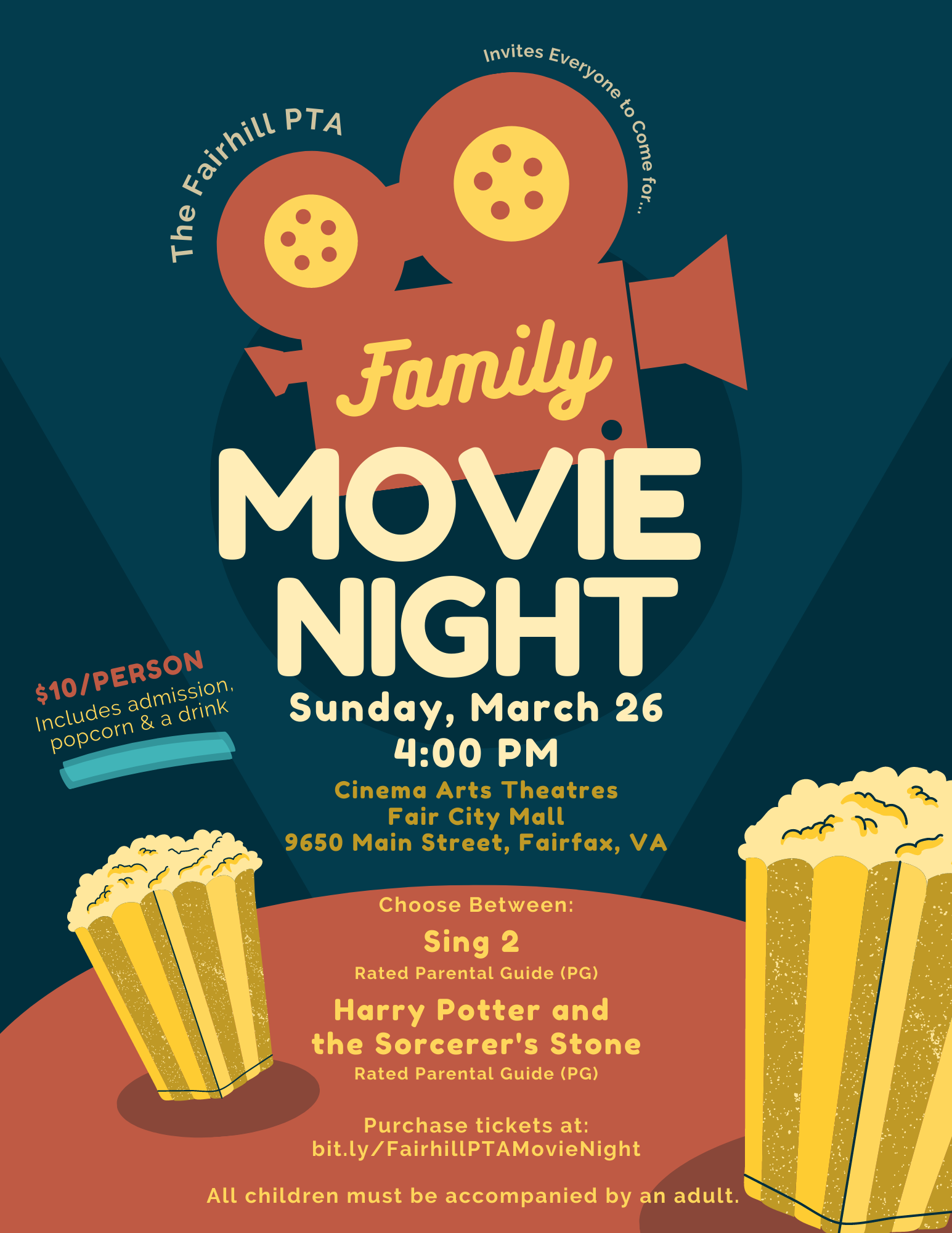 The PTA is excited to announce Family Movie Night at Cinema Arts Theatres (Fair City Mall) on March 26 at 4:00 pm. Families will have the choice between watching Sing 2 and Harry Potter and the Sorcerer's Stone. Tickets will be $10 per person, which includes admission, popcorn and a drink. Tickets can be purchased here. Please note that all children must be accompanied by an adult for the duration of the event. Click here to see the flyer.
