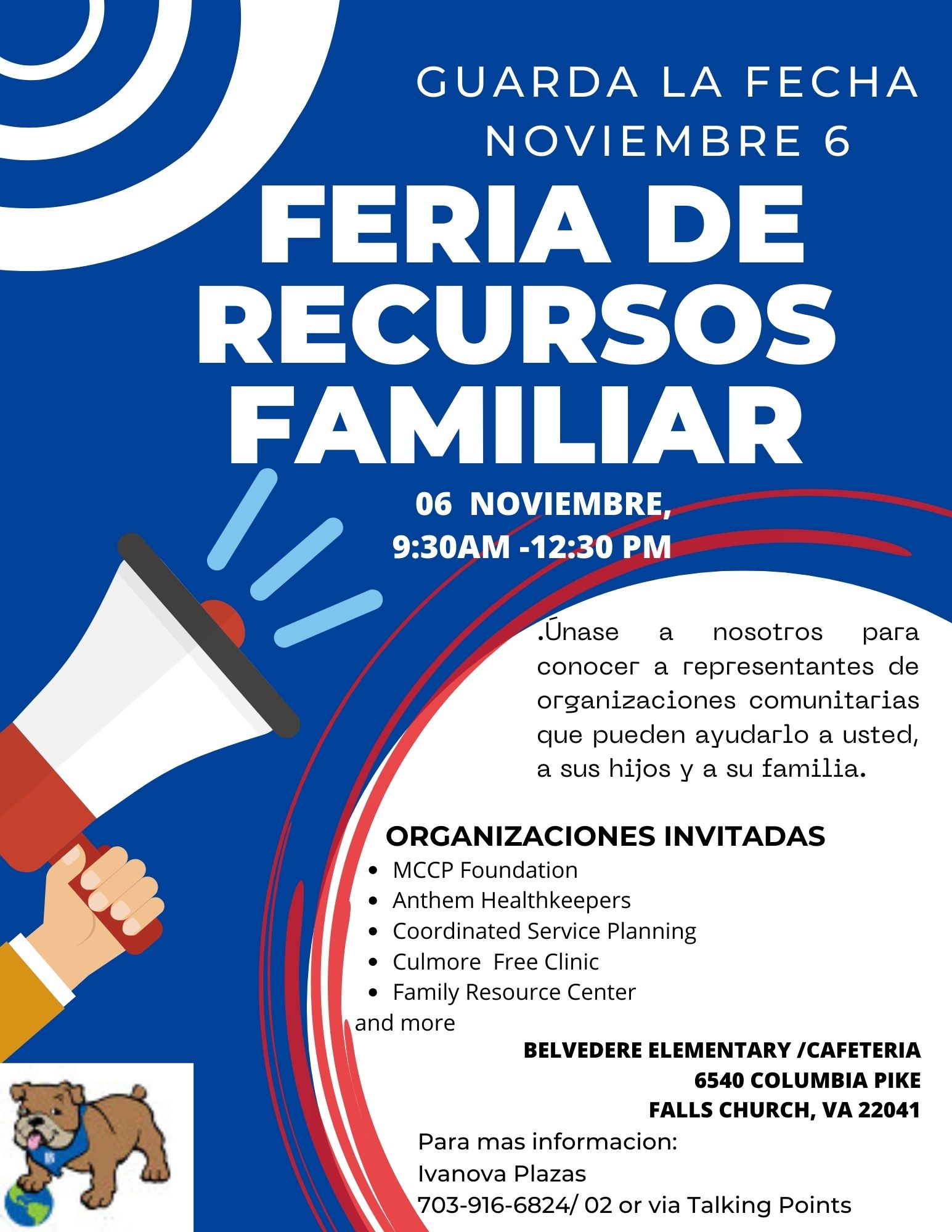 Feria de Recursos para Seguir Adelante con la Vida en la Comunidad, el Jueves, 9 de Noviembre, 6:30-8:30 p.m., en la Escuela Secundaria de Annandale (Cafetería).