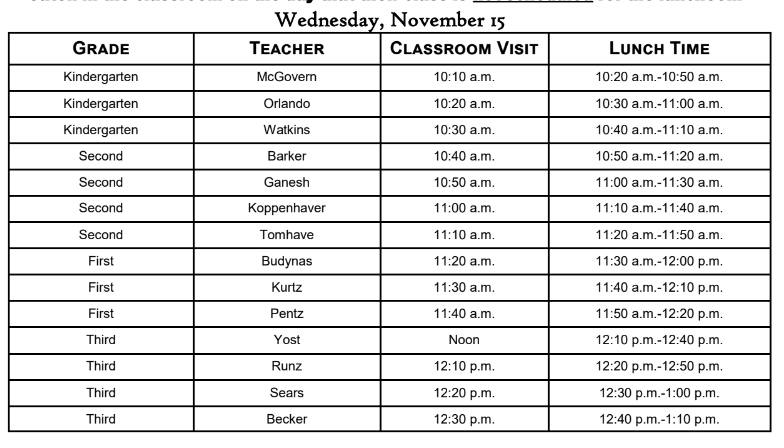 - Wed., Nov. 15 (K-3) and Thurs., Nov. 16 (4-6): Thanksgiving lunch with your favorite students