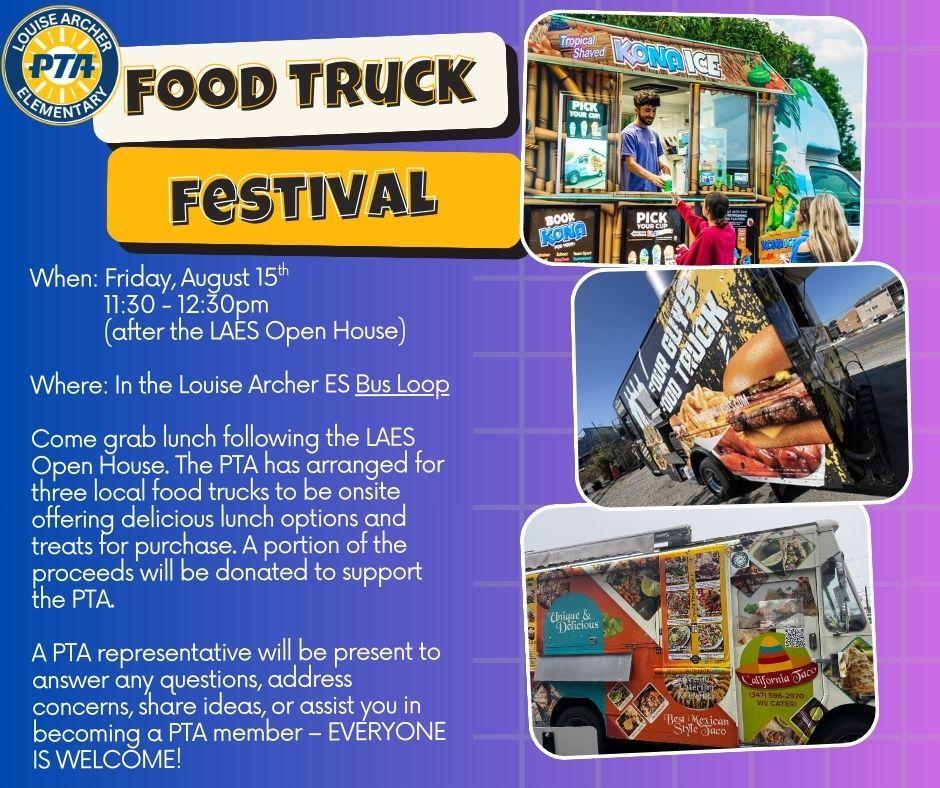 Lastly, we warmly invite you to join us following the Louise Archer Open House on Friday, August 15th, at 11:30 PM for a Food Truck Festival! The PTA has arranged for three local food trucks to be onsite offering lunch and treats for sale. A percentage of the proceeds will be donated to the PTA. A PTA representative will be present to answer any questions, address concerns, share ideas, or assist you in becoming a PTA member – everyone is welcome!
