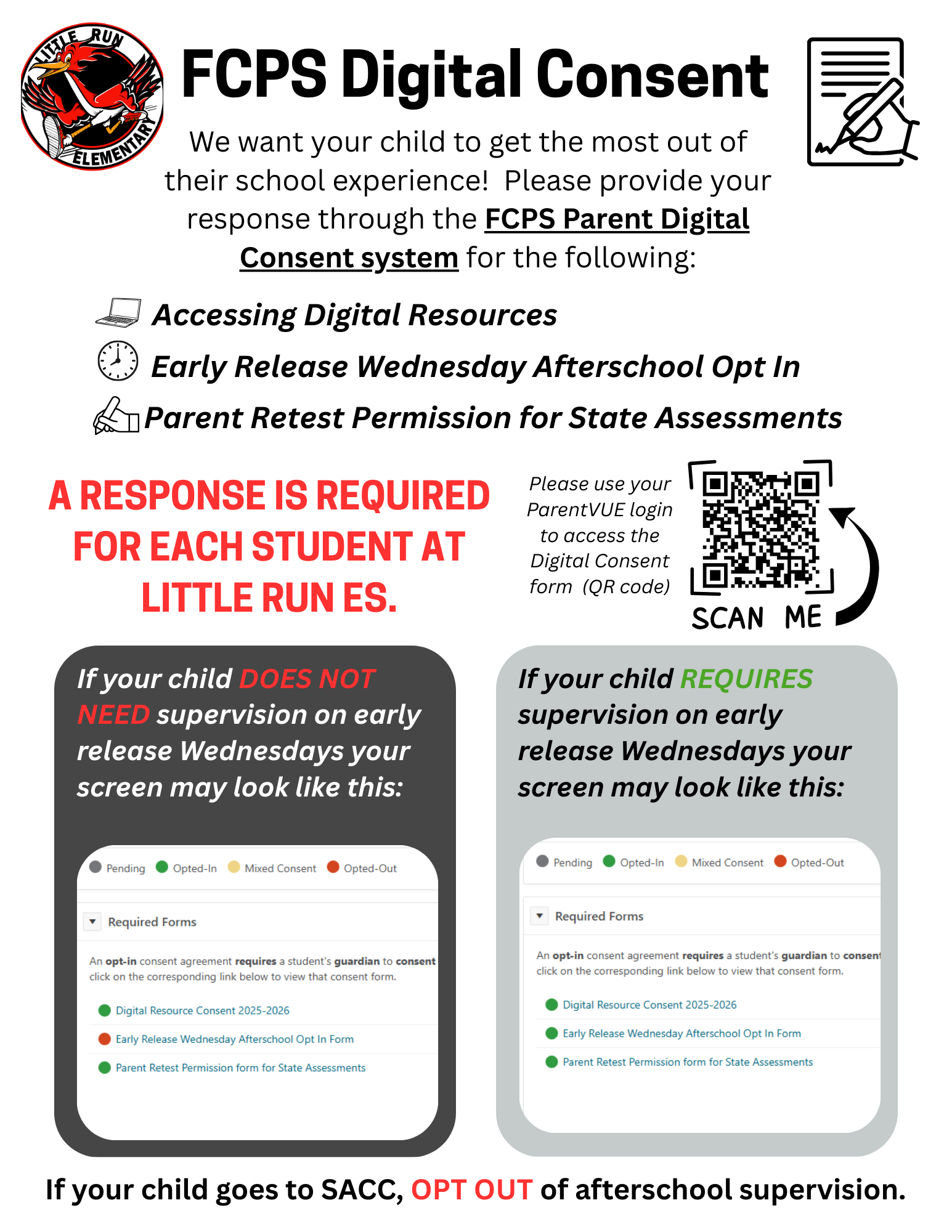 ACTION REQUIRED BY 8/25: Elementary school parents and caregivers should log in to the FCPS Parent Digital Consent system to review and provide consent for Early Release Wednesday Childcare. To learn more about Parent Digital Consent click here.