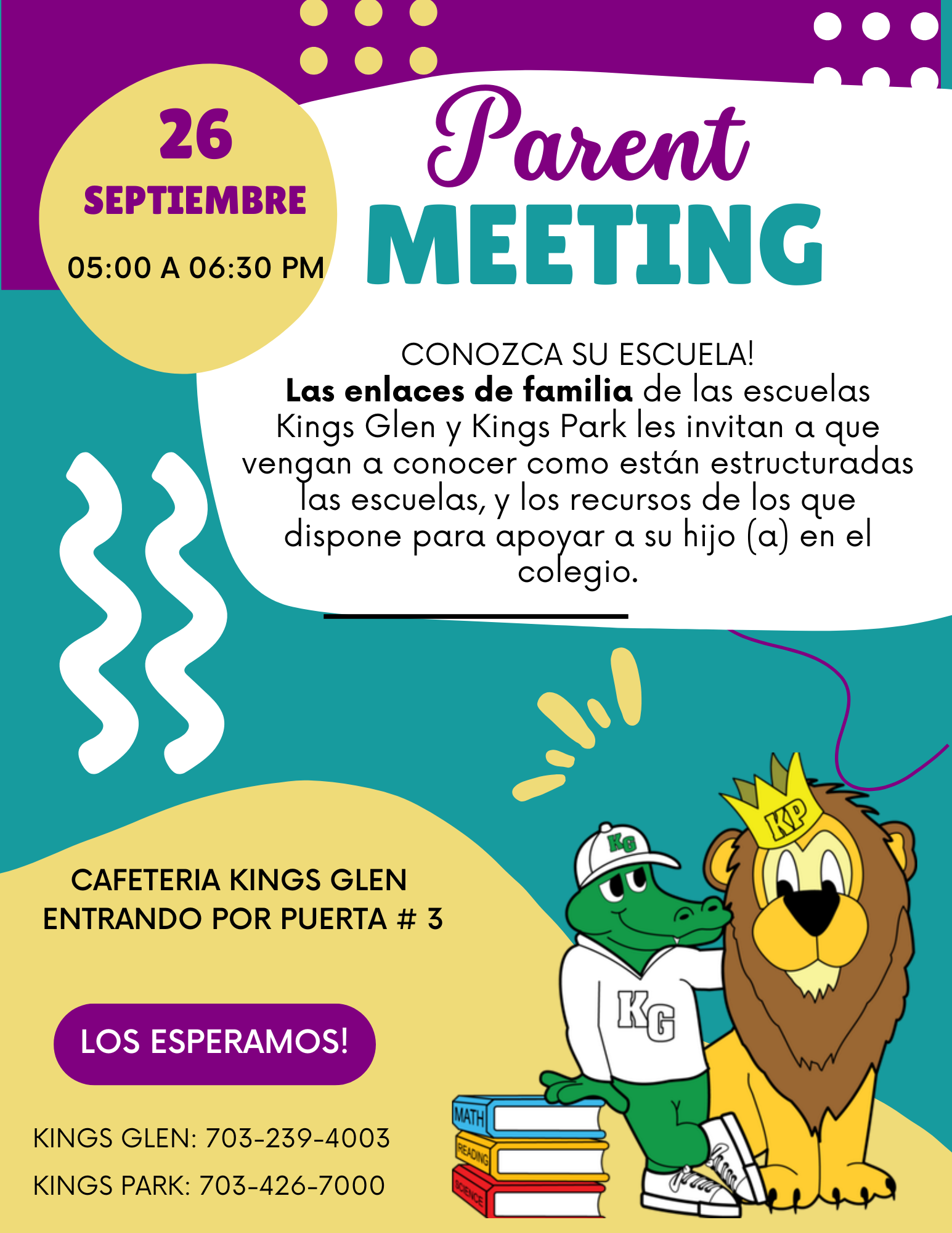 The Kings Park and Kings Glen family liaisons are hosting an informational meeting in Spanish on Friday, September 26th, from 5:00pm-6:30pm in the Kings Glen Cafeteria. Hispanic families in our school community are invited to learn about our schools and the resources available to support your child's learning.