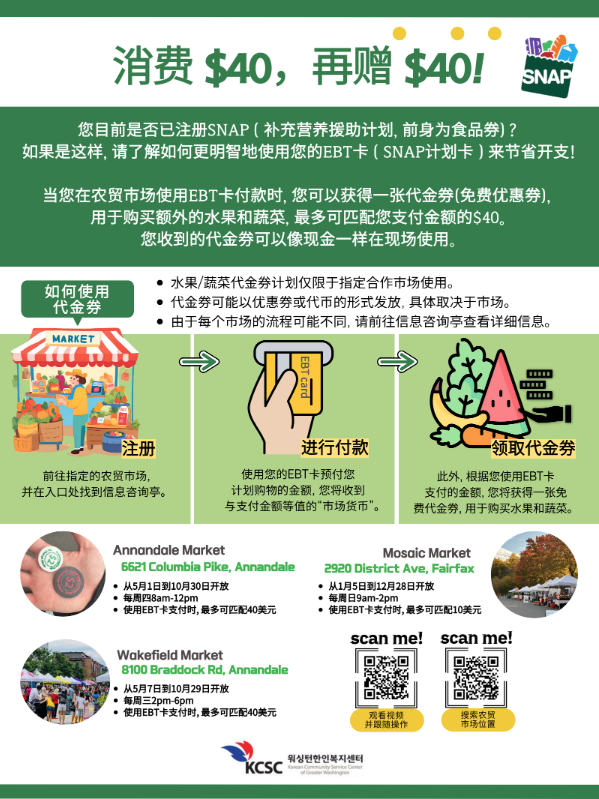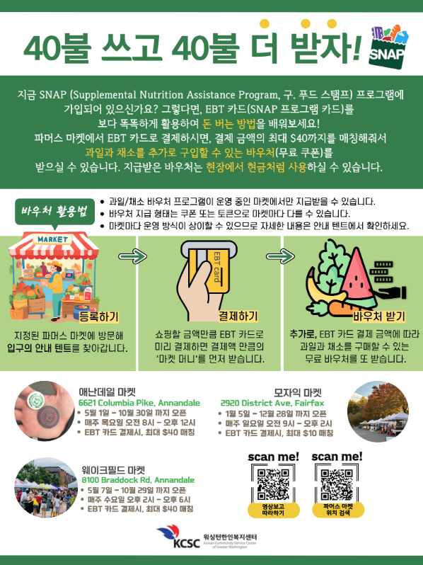 The Korean Community Service Center has developed a promotional poster on how to use SNAP benefits at Fairfax County Farmers Markets. Check it out!