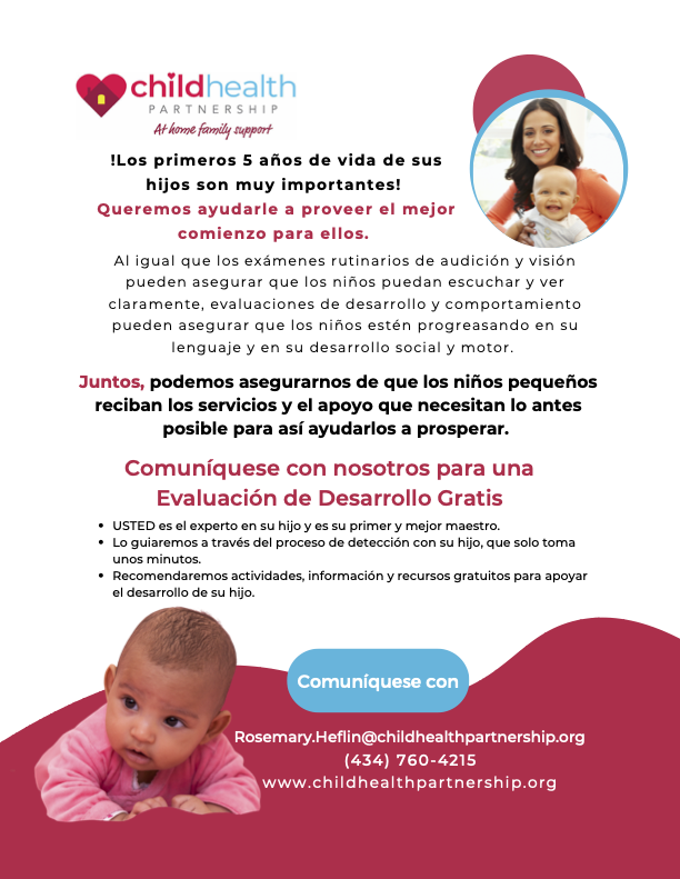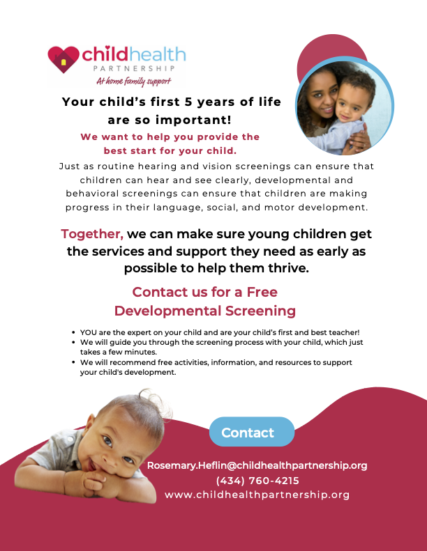 Did you know that Child Health Partnership (CHP) offers free developmental screenings for children in the Albemarle, Charlottesville, Fluvanna, and Louisa localities? By utilizing the Ages & Stages Questionnaire (ASQ) and Ages & Stages Questionnaire: Social/Emotional (ASQ:SE), CHP helps parents assess their child's progress and provides recommendations to support development.