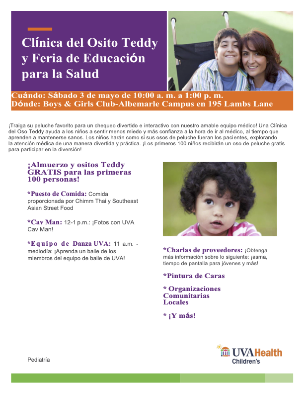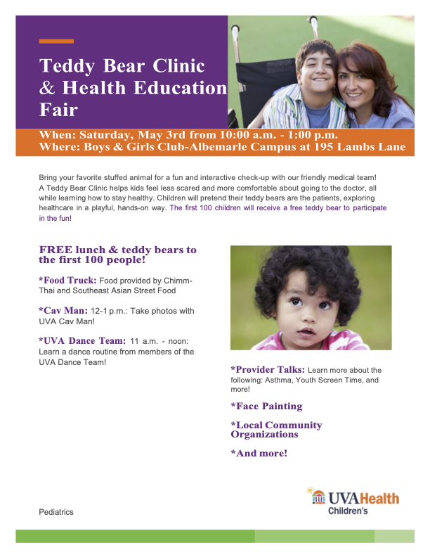 UVA Health Children's is hosting a Teddy Bear Clinic & Health Education Fair on Saturday, May 3 from 10 AM to 1 PM at the Boys & Girls Club in Albemarle.