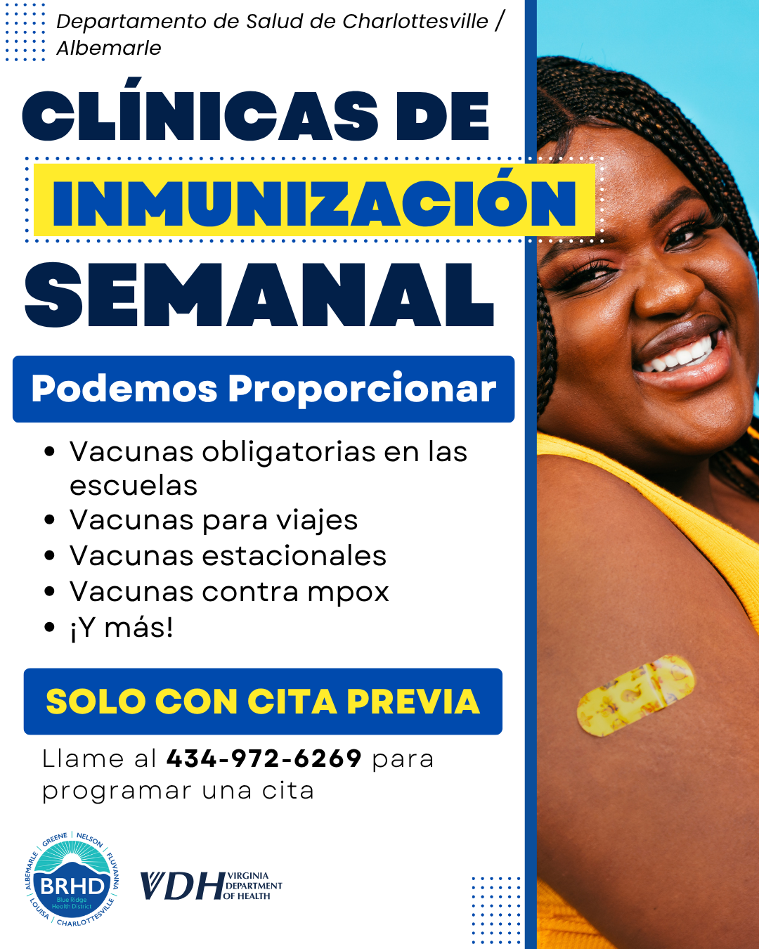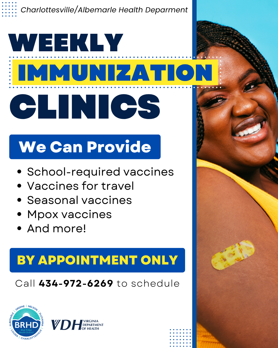 We’ve expanded our weekly immunization clinic schedule! The Charlottesville/Albemarle Health Department now offers vaccines by appointment twice a week on Mondays and Wednesdays. Our immunization clinics are open to all ages and offer a variety of vaccines, including: