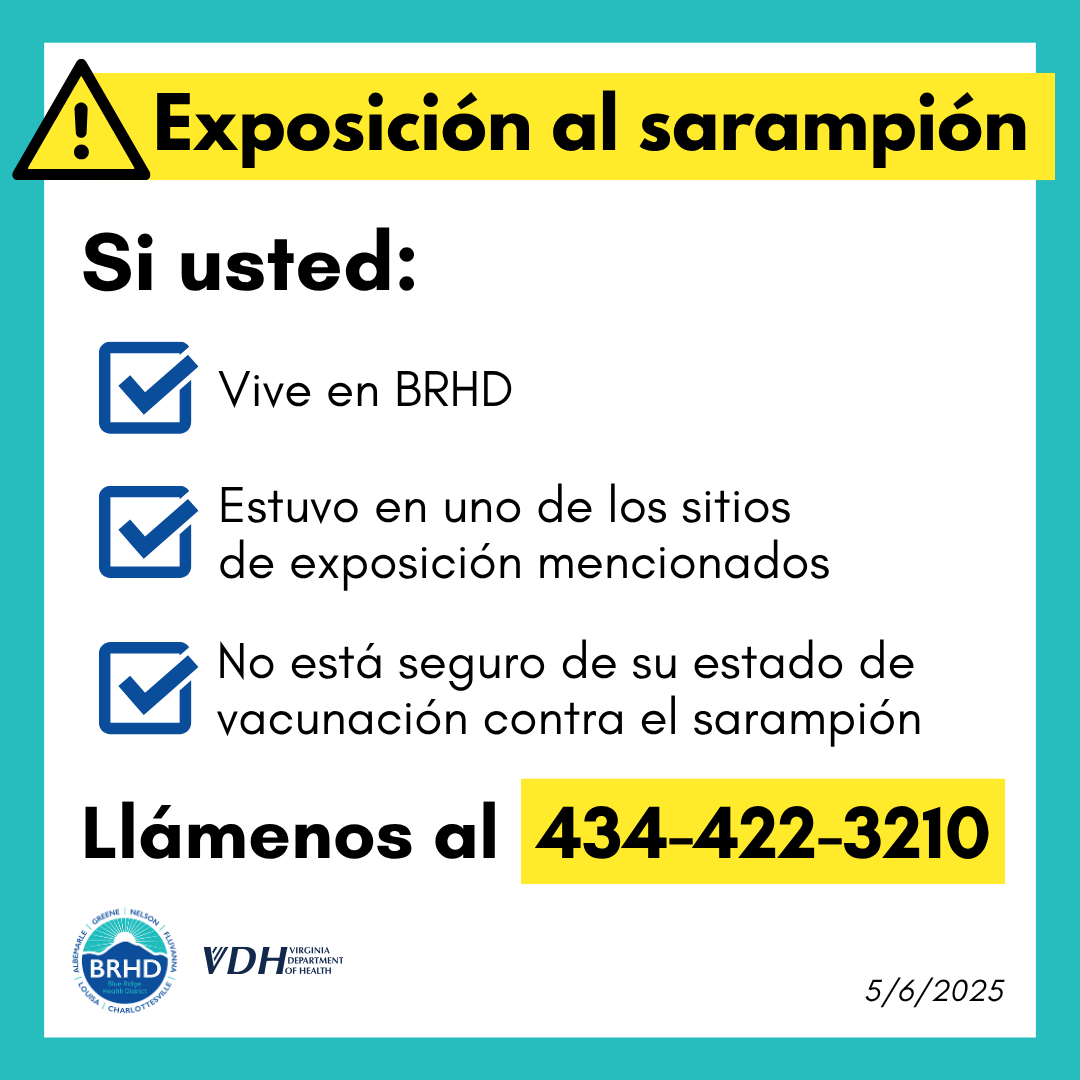 If you live in BRHD, were in either of these locations during the times listed, and are unsure of your measles vaccination status, please call us at 434-422-3210. This line is open during regular business hours and over the weekend.