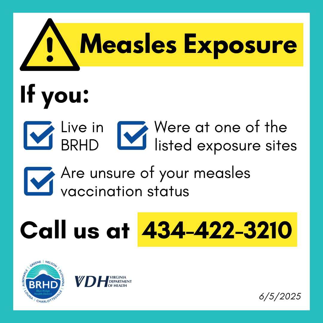 On June 5, VDH announced the third case of measles in the Northwest region of Virginia. Two potential exposure sites in Charlottesville and Albemarle County have been identified: