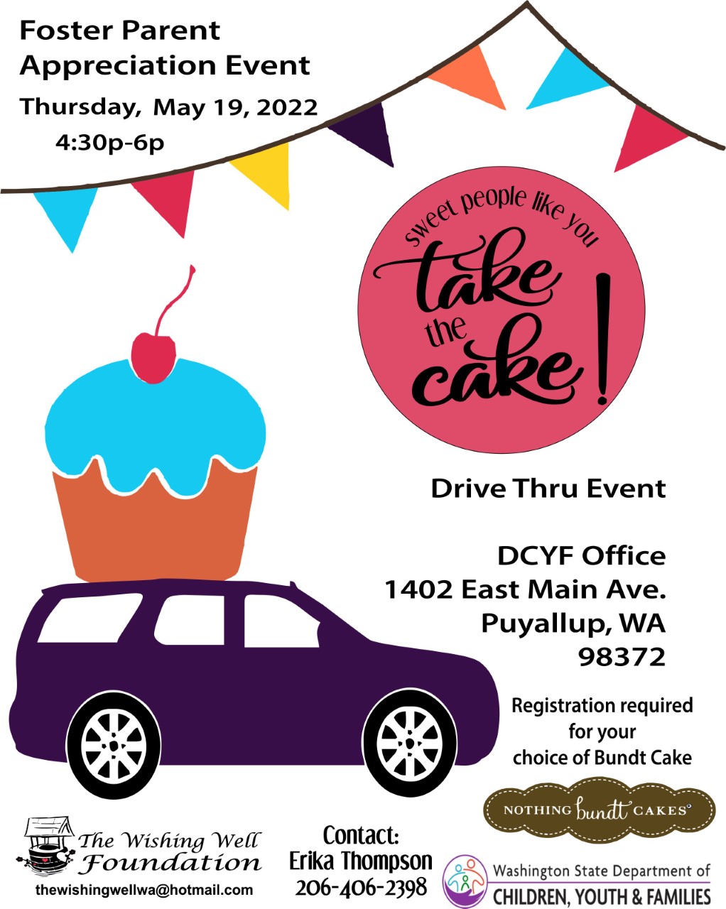 DCYF will join the Wishing Well Foundation for a Foster Parent Appreciation Event. Caregivers must register by contacting Erika Thompson at 206-406-2398. Registered attenedes will have their choice of Bundt cake!