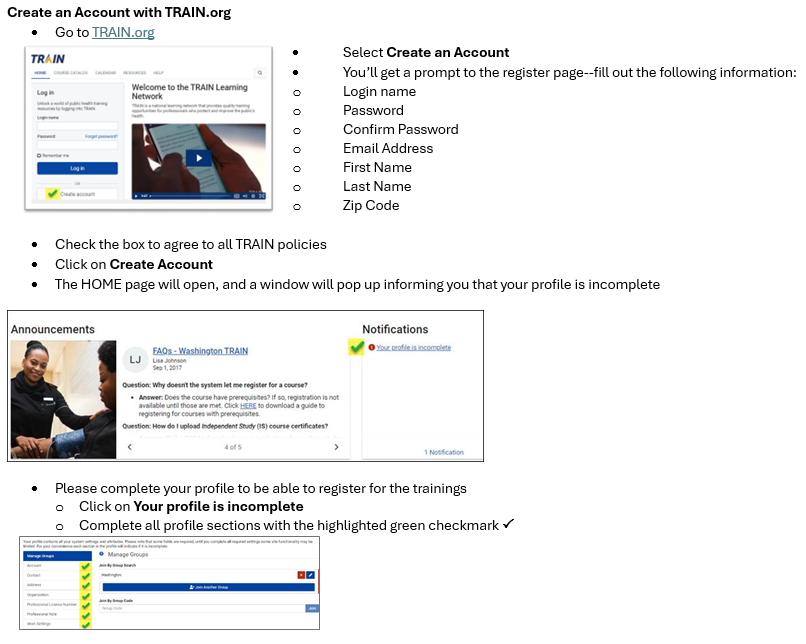 We changed our process for registering for our clinical immunization webinars and obtaining continuing education credits. Webinar attendees are now required to create an account in TRAIN.org in order to register for immunization webinars and instantly generate continuing education certificates or a certificate of completion. Please follow the steps outlined below to create an account and register for clinical immunization webinars.