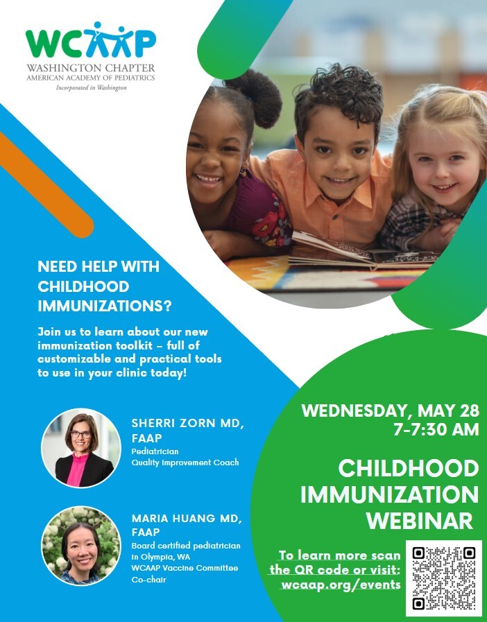 The Washington Chapter of the American Academy of Pediatrics (WCAAP) is excited to announce the release of our new Childhood Immunization Toolkit, designed to support well-child visits and on-time vaccination across early childhood. We will showcase the toolkit and its practical, customizable resources during an upcoming webinar on May 28 at 7:00am.