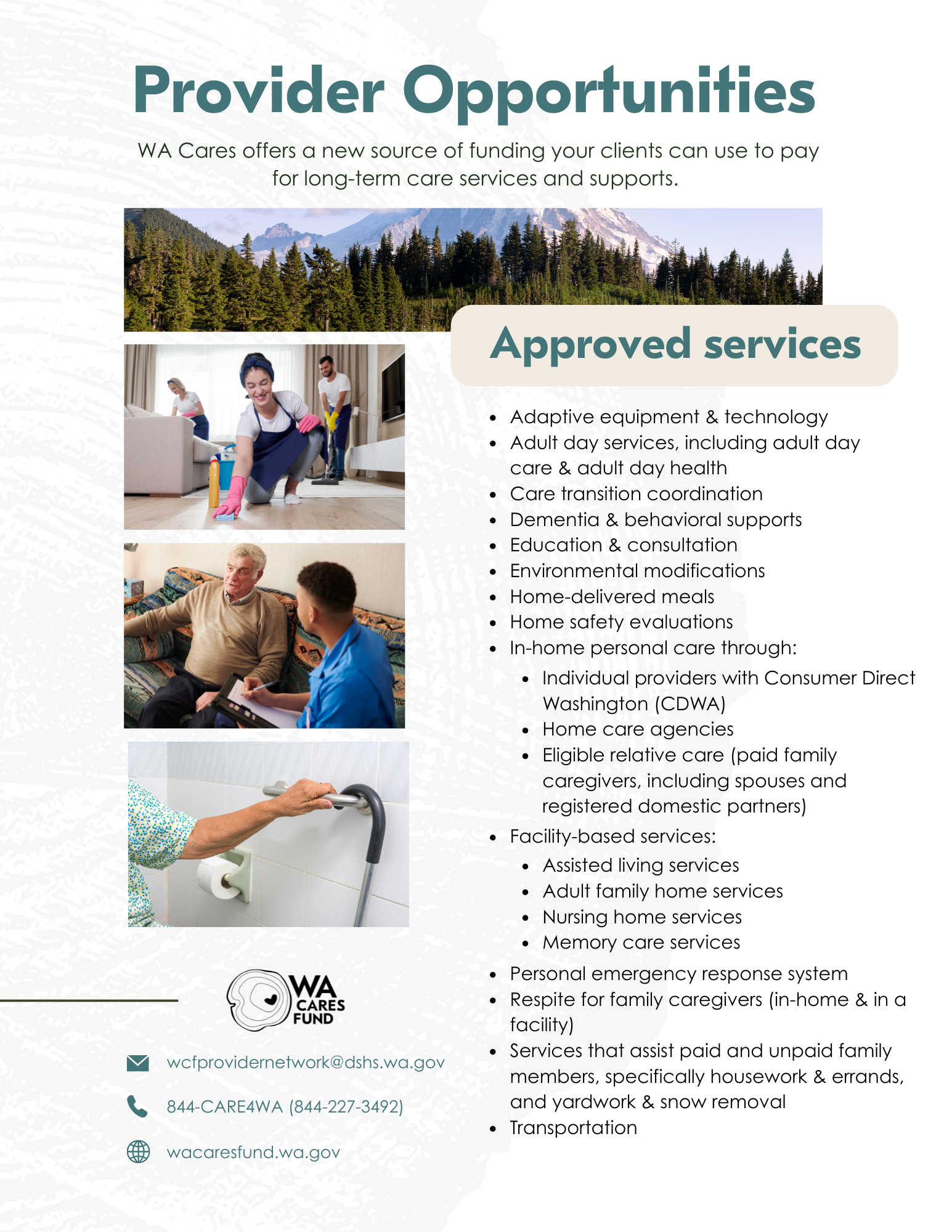 Before WA Cares Fund benefits begin in July 2026, WA Cares will work to register a diverse range of qualified providers for each covered service. To ensure quality care, providers must meet minimum qualifications to participate. Once registered, beneficiaries can choose from these providers — empowering them to select the services that best meet their needs within their own communities.