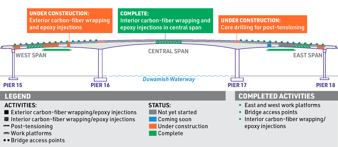 We also continued progress on other repair work, including epoxy crack-injection and carbon-fiber wrapping on the bridge’s exterior. We completed more core-drilling and form work this week to prepare for new post-tensioning.