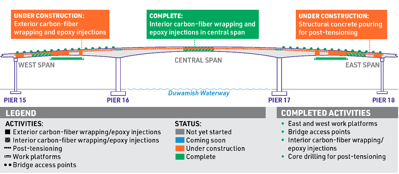 We also made progress on major maintenance work for the West Seattle Bridge this week. This work included preparation for the replacement of overhead signage and more expansion joints on the bridge.