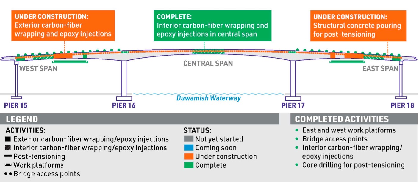 If you missed it, watch our latest video to see us in action as they apply carbon-fiber to the underside of the bridge and construct new post-tensioning concrete components.
