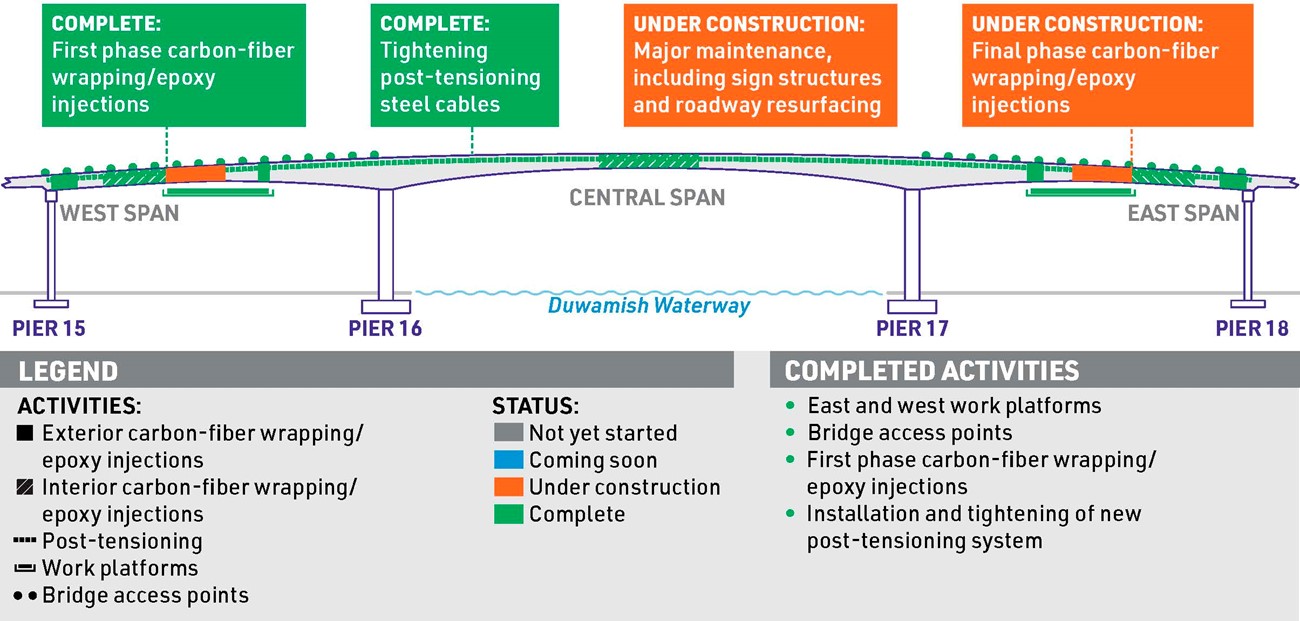 The final phase of epoxy crack injection and carbon-fiber wrapping is underway on the West Seattle Bridge. We’re using the same methods from before the new post-tensioning system was completed: strengthening and reinforcing sections of the bridge’s concrete by filling existing cracks with an epoxy compound and applying sheets of polymer-infused carbon-fiber. Along with the compression forces from the post-tensioning system, these repair methods work to prevent the concrete from cracking in the future.