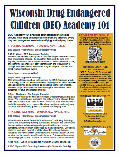 Registration Now Open for Free DEC Training! Wisconsin Department of Justice sent this bulletin at 08/29/2023 12:06 PM CDT Having trouble viewing this? View it as a webpage Wisconsin Drug Endangered Children (DEC) Academy 101 November 7 & 8, 2023 Download Flyer Here