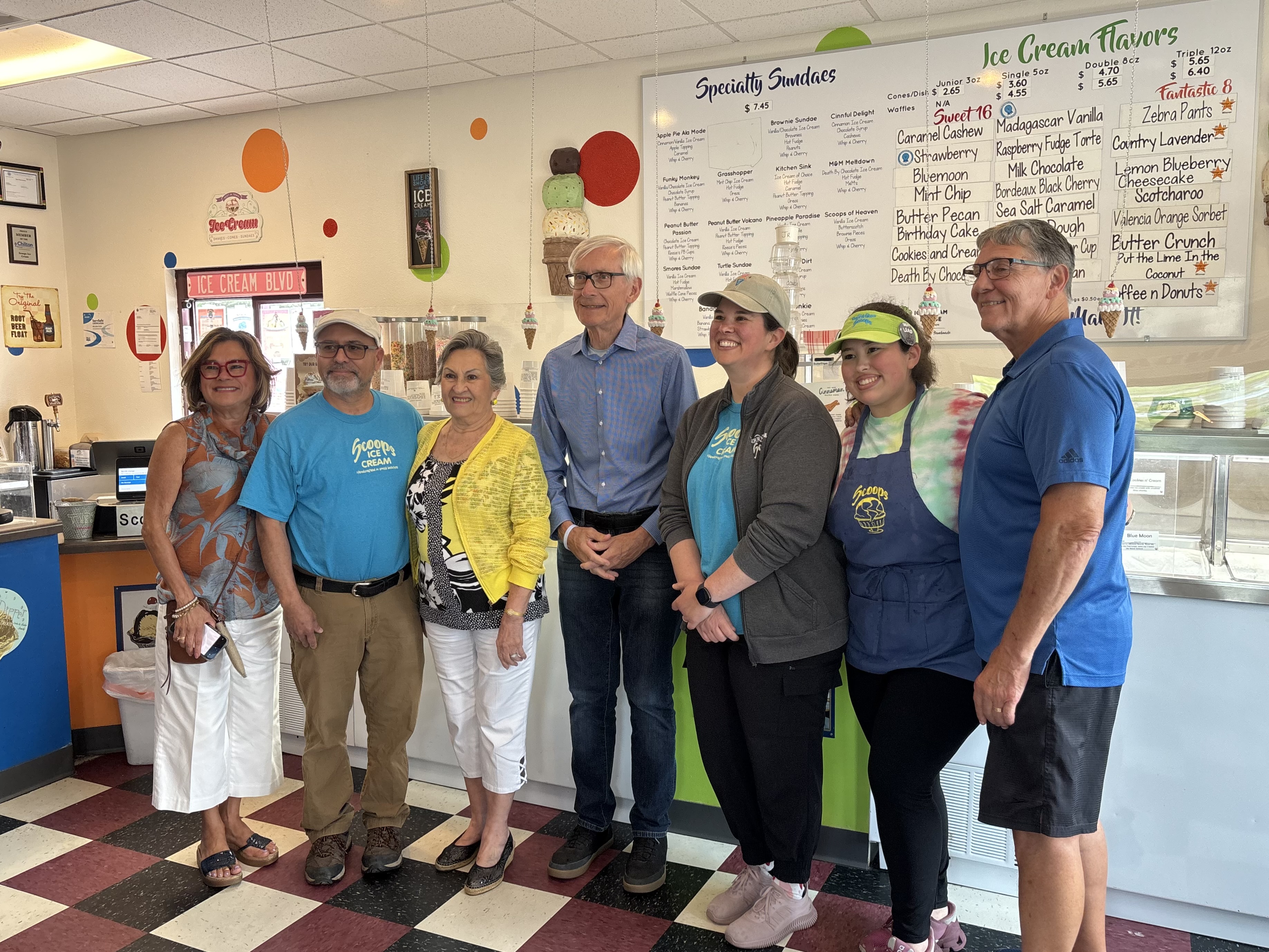 On July 30, Gov. Evers, together with Manitowoc Mayor Justin Nickels, visited Cedar Crest Ice Cream Parlor in Manitowoc and met with community members, including Cedar Crest Ice Cream President Ken Kohlwey, folks from local tourism organizations, labor groups, and the Manitowoc Public School District, to discuss measures included in the bipartisan, pro-kid budget that will help support Manitowoc’s kids, schools, industries, and community. This included funding to support the restoration of the USS Cobia at the Wisconsin Maritime Museum in downtown Manitowoc. While there, the governor also heard about the city’s sustainability efforts to divert paper and plastic waste and use it to generate power for their community. Photos of the governor’s visit to Cedar Crest in Manitowoc are available here and here.