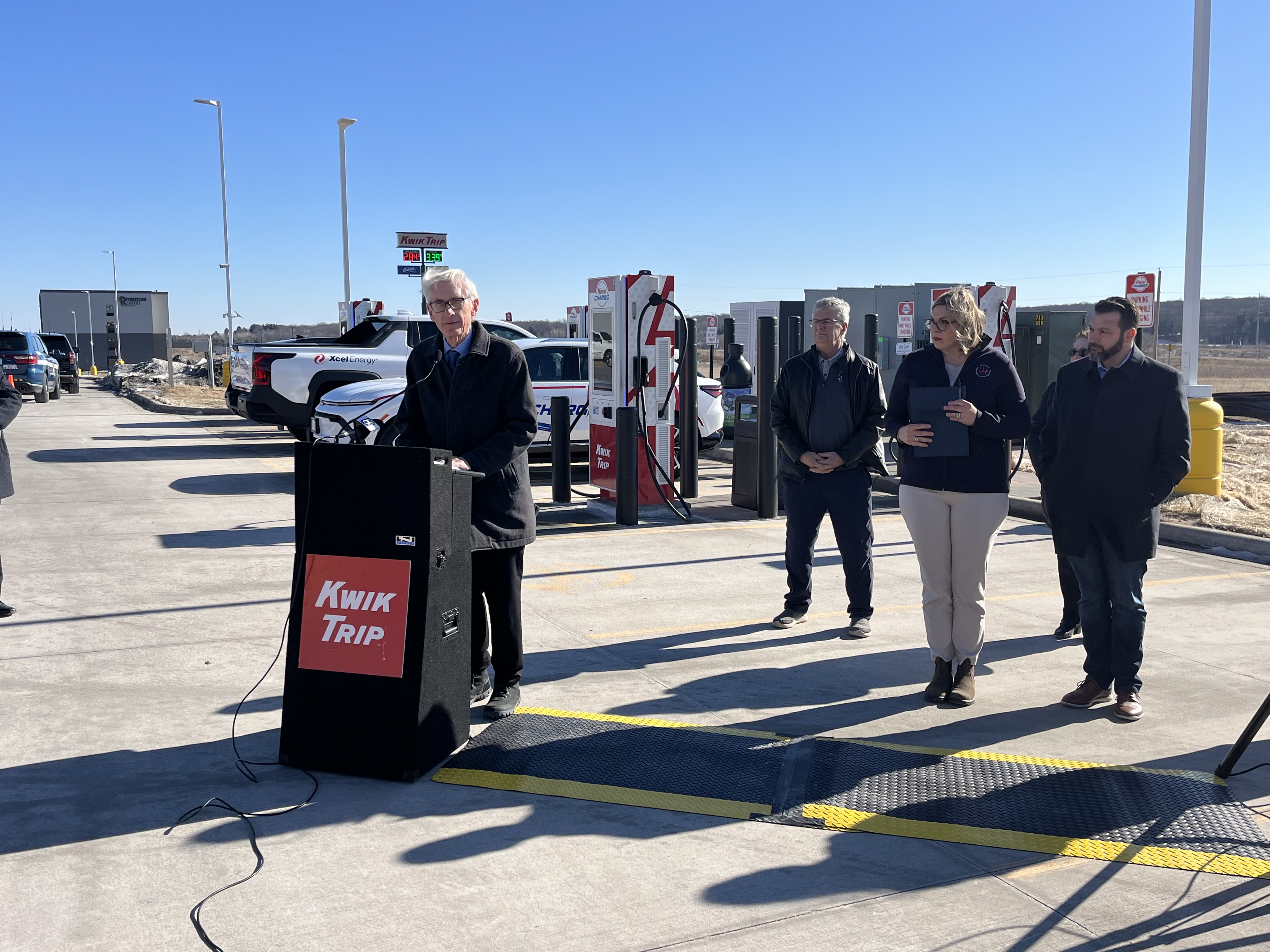 In January, Gov. Evers, together with WisDOT Secretary Boardman and Public Service Commission of Wisconsin (PSC) Commissioner Kristy Nieto, visited a Kwik Trip in Chippewa Falls where they held a press conference with Kwik Trip and Xcel Energy officials to celebrate the opening of the first electric vehicle (EV) charging stations in Wisconsin funded by the National Electric Vehicle Infrastructure (NEVI) Formula Program under the Bipartisan Infrastructure Law (BIL). Photos of the event are available here and here.