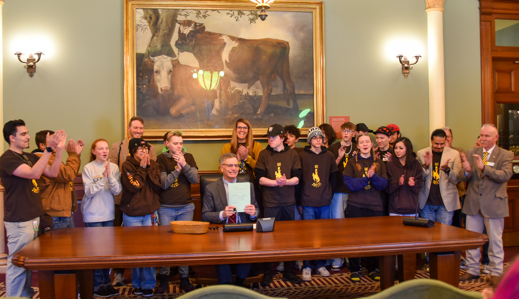 At a public signing, Governor Gordon heard from students from Cheyenne’s Triumph High School, where a school effort to encourage statewide community spirit and unity culminated in House Bill 246 Wyoming Wednesday. The bill reads, in part, “In celebration of the state of Wyoming and in an effort to bring unity to the state's communities, the second Wednesday of every month shall be known as ‘Wyoming Wednesday – Brown and Gold Day’. Wyoming citizens may wear brown and gold in recognition of Wyoming Wednesday.”