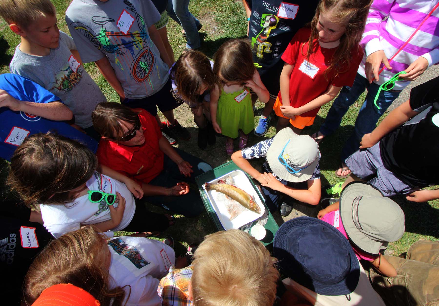 Jackson Fish Biologist Diana Miller explains fish anatomy to an attentive group of kids.