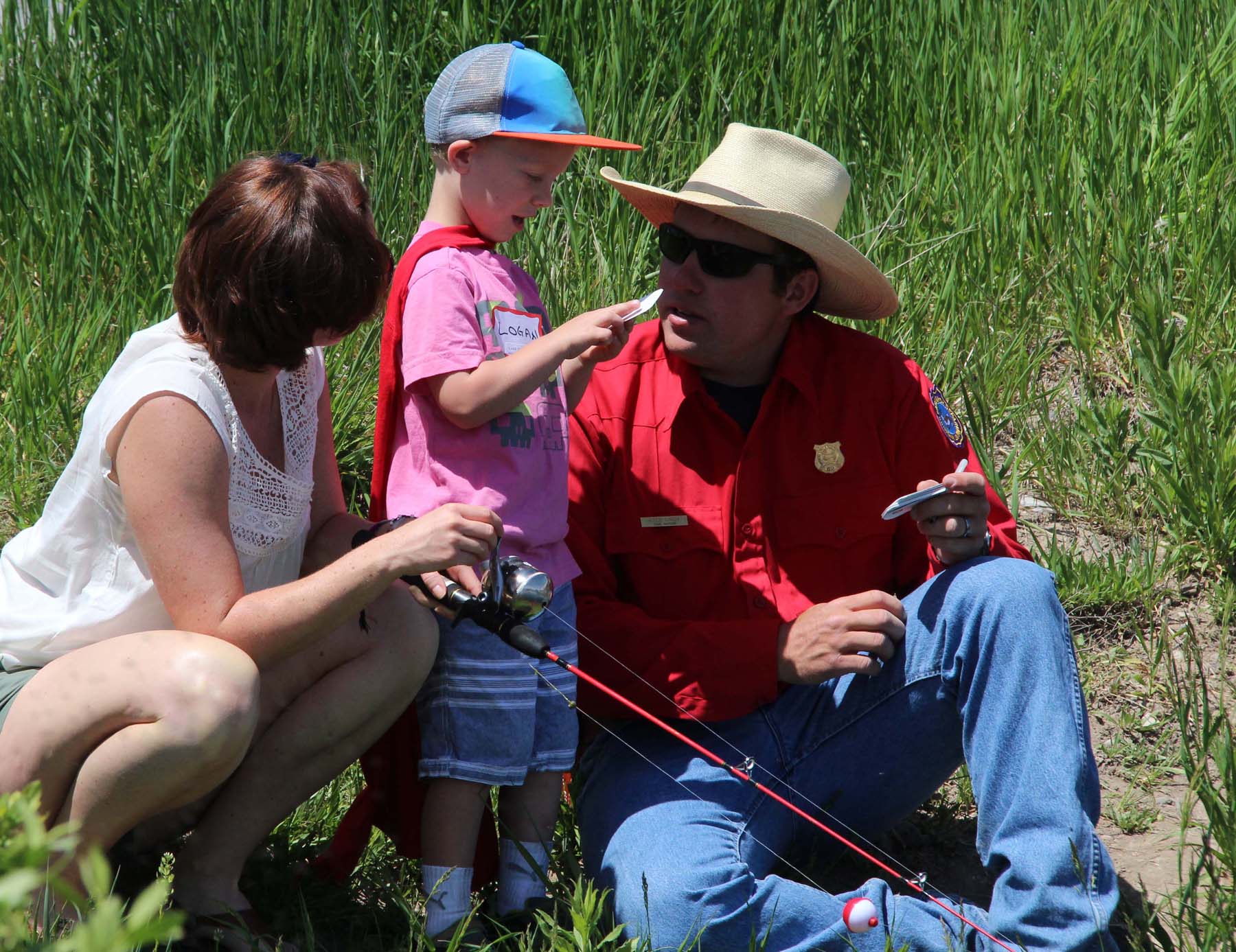 Jackson Game Warden Kyle Lash gives a youngster a Free Resident Junior Fishing Permit.