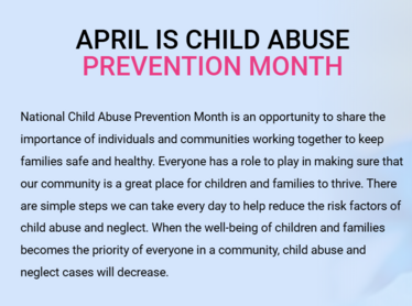 These events provide opportunities for residents to learn how to recognize and prevent child abuse, support victims, and strengthen families: