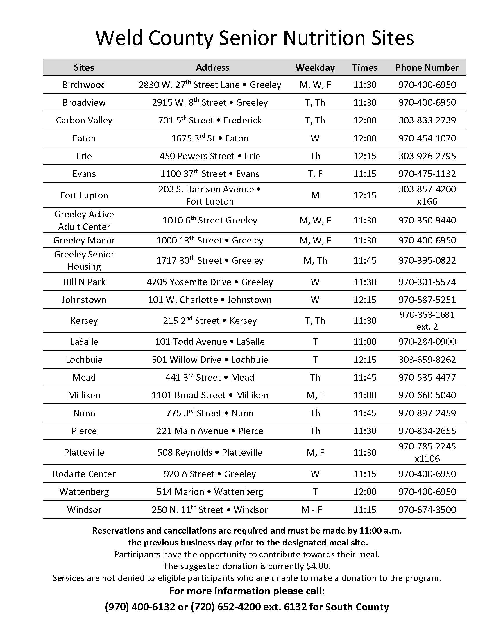For more information regarding any meal sites or menus call 970-400-6132 or viewing Friendly Fork (Senior Nutrition) – Weld County (weldgov.com). Reservations and cancellations are required and must be made in advance by 11:00 am the previous business day to the site coordinator, by calling 970-400-6955 or emailing friendlyfork@weldgov.com.