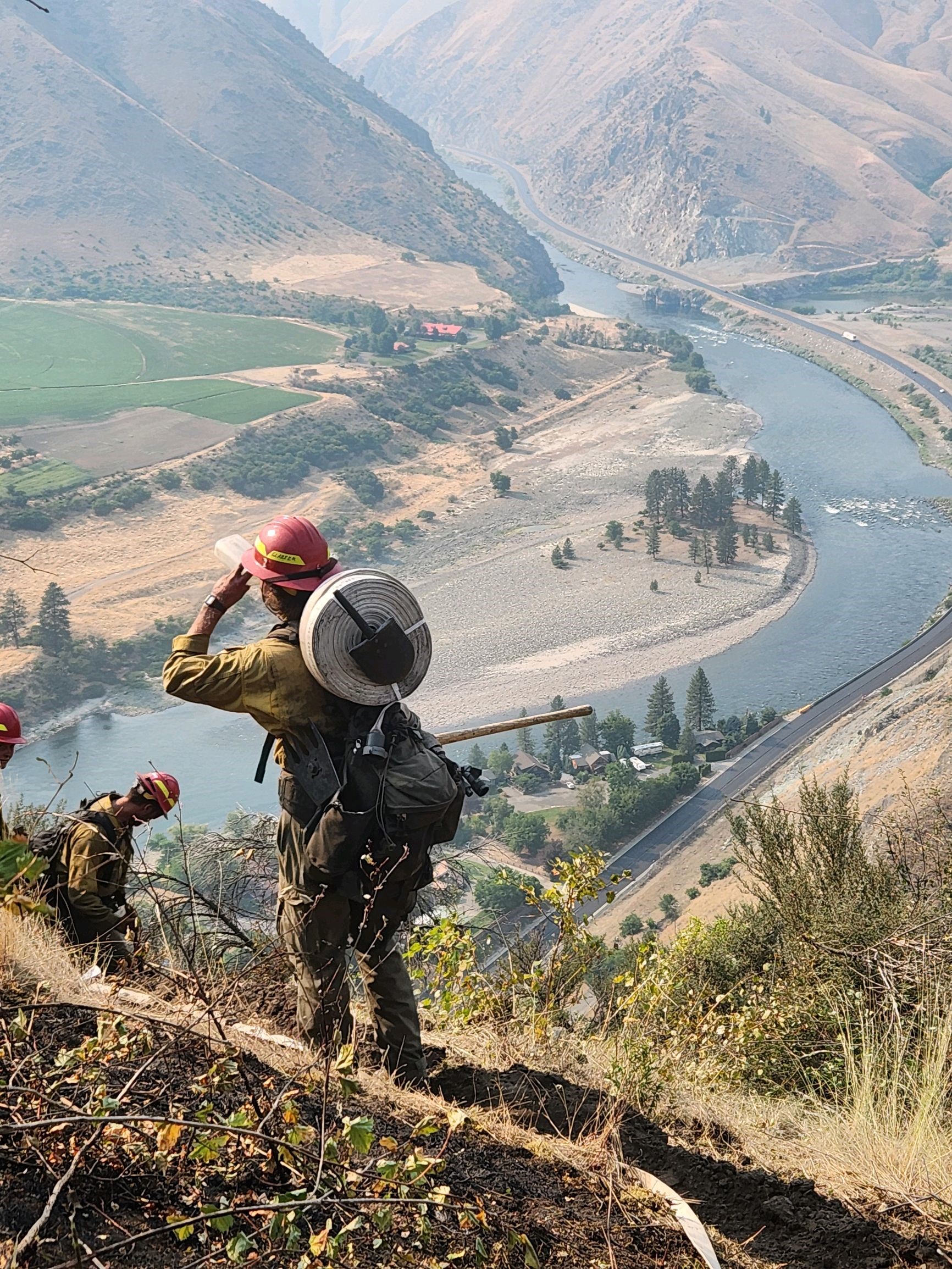Photo by: Quinn Glazier, Idaho Department of Lands: A firefighter staying hydrated during mop up operations on the Steelhead Fire. Steep rugged terrain with Salmon River in the background.