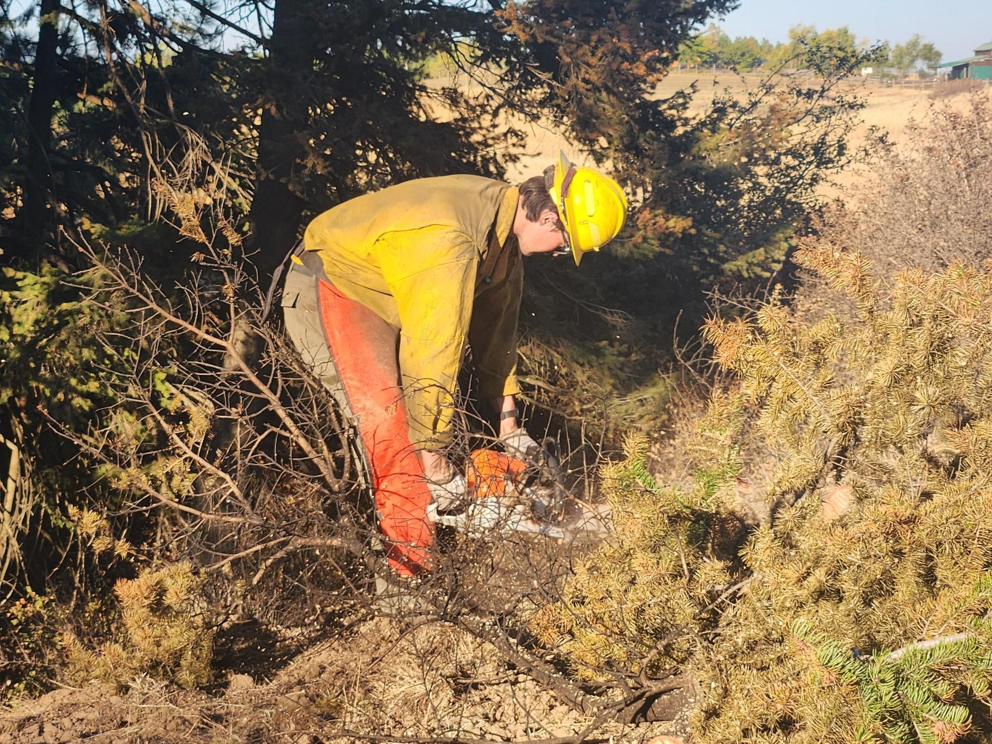 Firefighters spent the day setting hose lay, cutting hazard trees and beginning mop-up operations. The fire continues to lay down at night.
