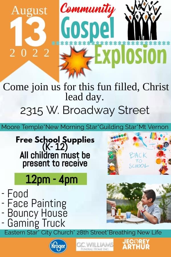 Join us for the Community Gospel Explosion this Saturday, August 13, at Moore Temple Church from 12 PM to 4 PM. Churches are coming together with good singing, food, and supplies. This event has been sponsored by Metro Council District 4. To learn more, click here.
