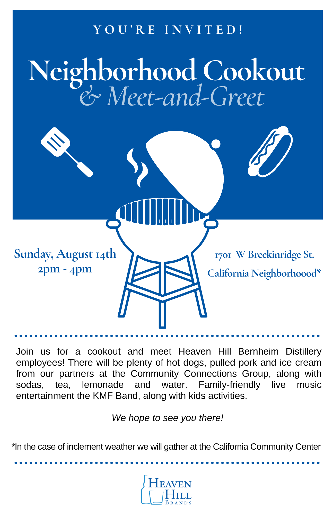 Join us for a cookout with your California neighbors and meet Heaven Hill Bernheim Distillery employees! There will be plenty of hot dogs, pulled pork and ice cream from our partners at the Community Connections Group, along with sodas, tea, lemonade and water. Family-friendly live music entertainment from the KMF Band, along with kids activities. To learn more, click here.