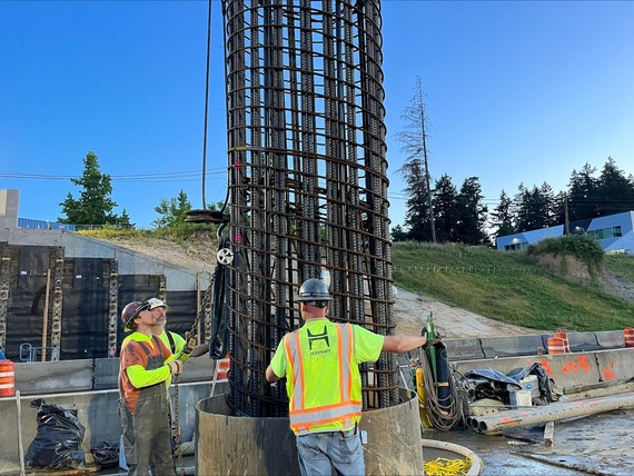 Lowering in a rebar cage for one of the overpass shafts in the highway median.