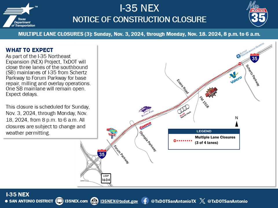 Three lanes of the southbound mainlanes of I-35 from Schertz Parkway to Forum Parkway will be closed for base repair, milling and overlay operations. One southbound mainlane will remain open. Expect delays.