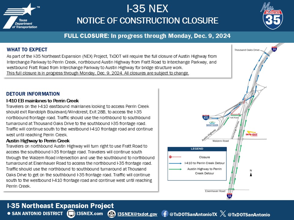 Full closure of Austin Highway from Interchange Parkway to Perrin Creek, northbound Austin Highway from Fratt Road to Interchange Parkway, and westbound Fratt Road from Interchange Parkway to Austin Highway for bridge structure work.