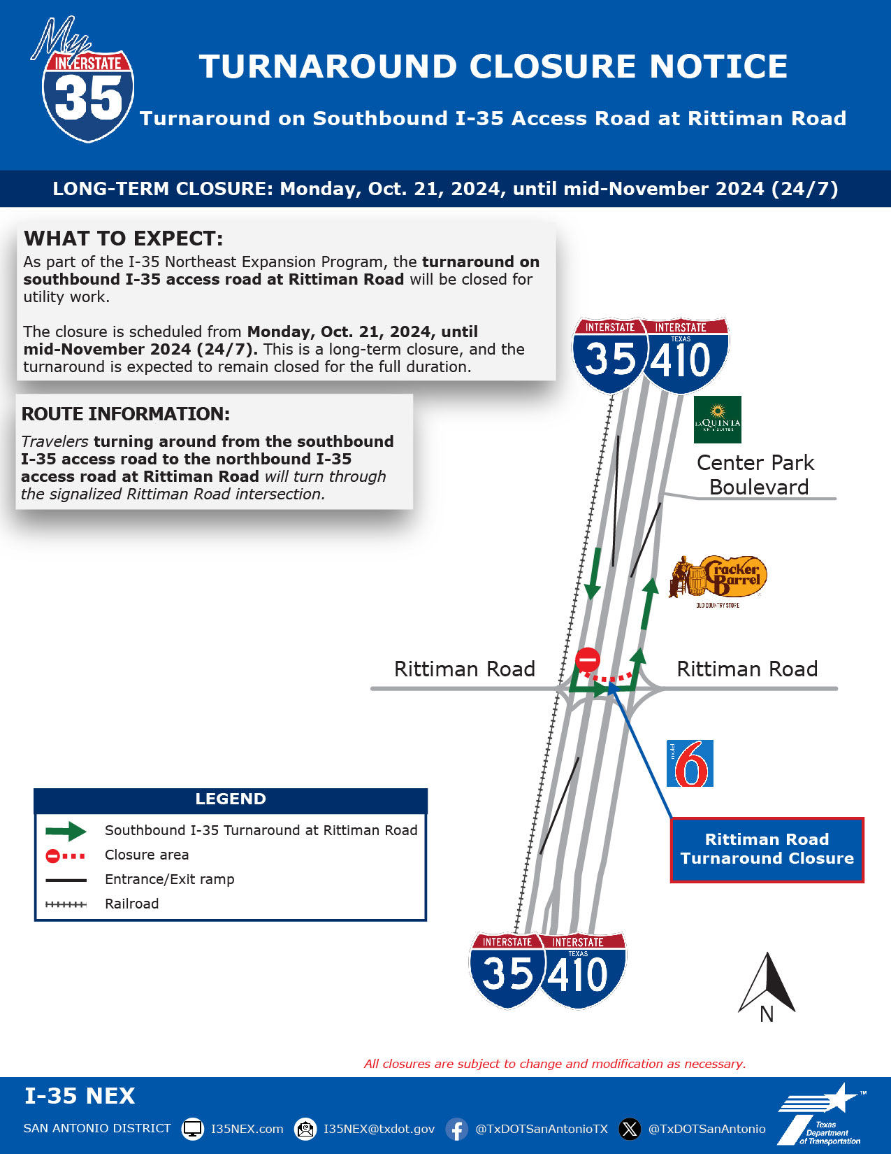 The turnaround on southbound I-35 access road at Rittiman Road will be closed for utility work.