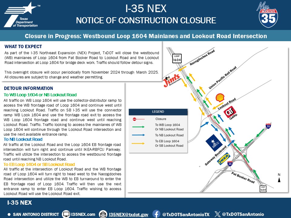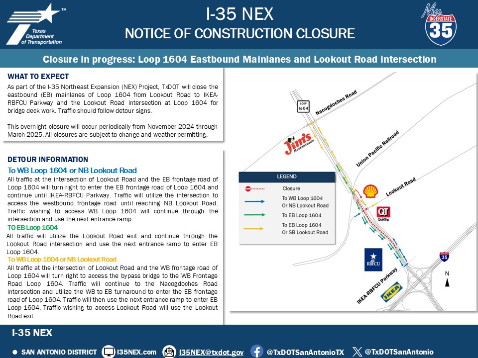 Nightly closures the eastbound mainlanes of Loop 1604 from Lookout Road to IKEA-RBFCU Parkway and the Lookout Road intersection at Loop 1604 for bridge deck work. Traffic should follow detour signs.