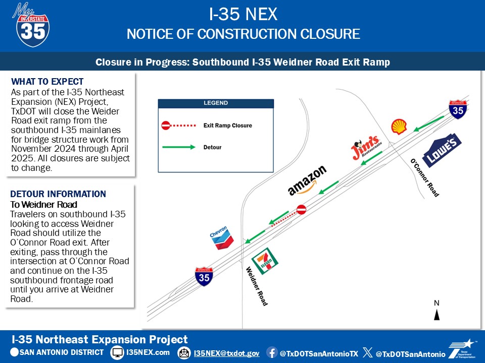 The Weidner Road exit ramp from the southbound I-35 mainlanes is closed for bridge structure work.