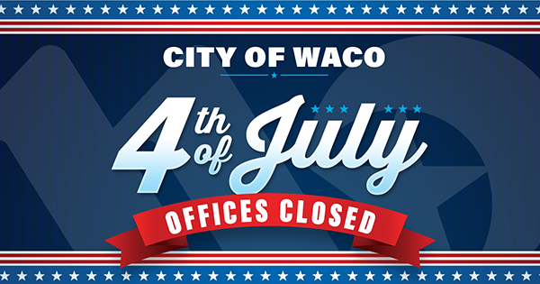 City of Waco offices will be closed for Independence Day on Friday, July 4. Residents with a Friday trash collection day will have their gray waste carts and green yard waste carts collected earlier on Wednesday, July 2.