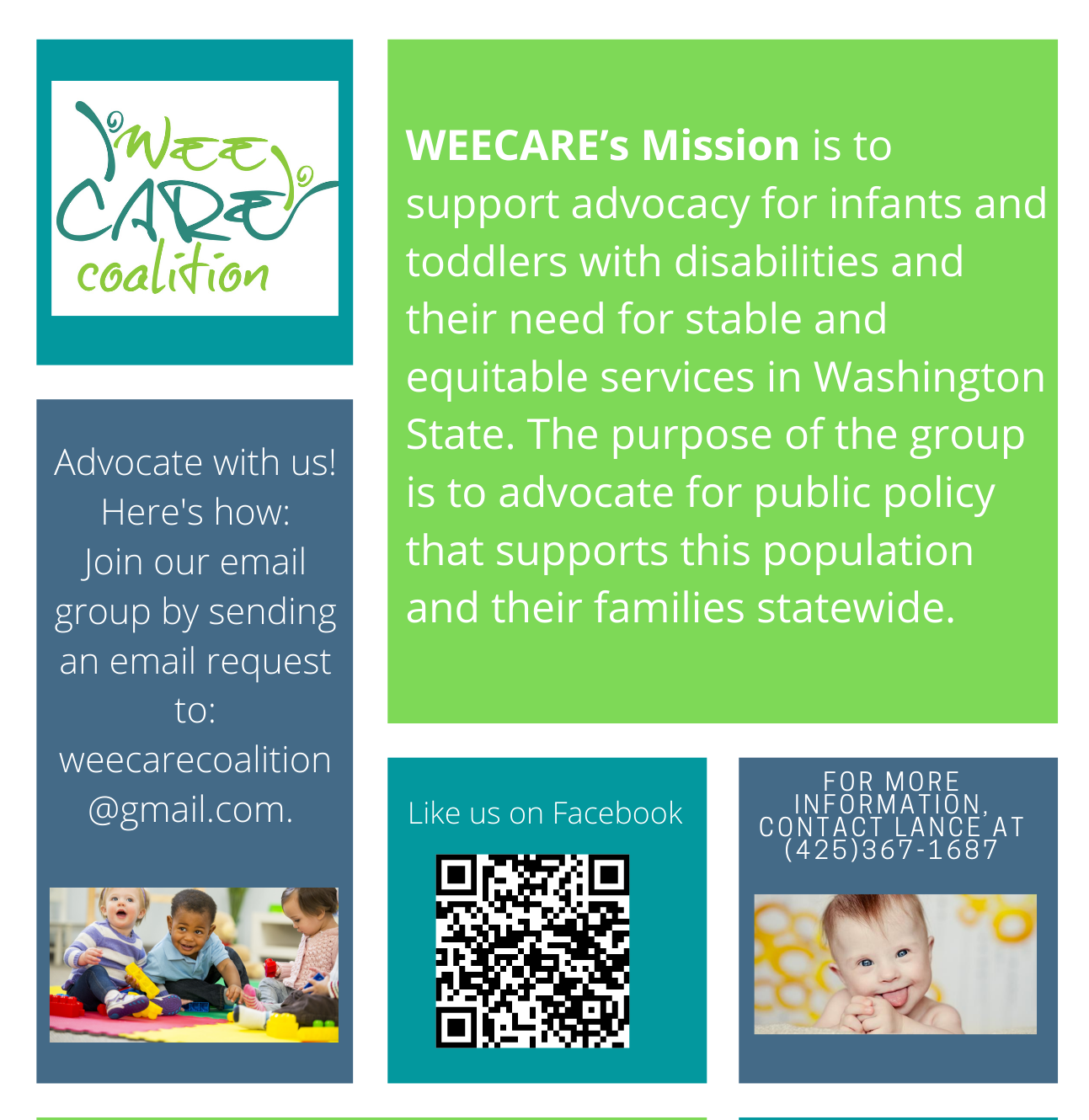 WEECARE's Mission is to support advocacy for infants and toddlers with disabilities and their need for stable and equitable services in Washington State. The purpose of the group is to advocate for public policy that supports this population and their families statewide.