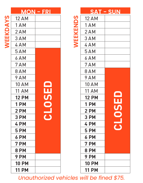 • Low bridge is closed to most vehicles weekdays from 5 AM to 9 PM and weekends 8 AM to 9 PM Unauthorized vehicles will receive a $75 ticket for every trip across the bridge.